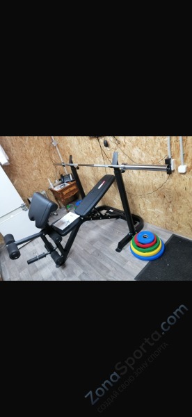 Телескопические стойки для грифа имеют 8 положений регулировки фиксации штанги по высоте, высоту самих стоек тоже можно менять. Подойдет штанга от 1,8 м. Скамья — с 5 уровнями наклона спинки, от горизонтального до почти вертикального. Можно менять положение тела и делать акцент на разные группы мышц. Предусмотрены дополнительные опции: для проработки передней/задней поверхности бедра, ягодиц (упражнения на сгибание или разгибание ног). Еще одна дополнительная опция — скамья Скотта (упражнения на проработку бицепса). Рама из стального профиля покрыта порошковой краской, толщина профиля - 3 мм. Обивка из плотной экокожи с усиленными швами. На специальную втулку навешиваются диски диаметр дисков 26 или 50 миллиметров. Габариты: